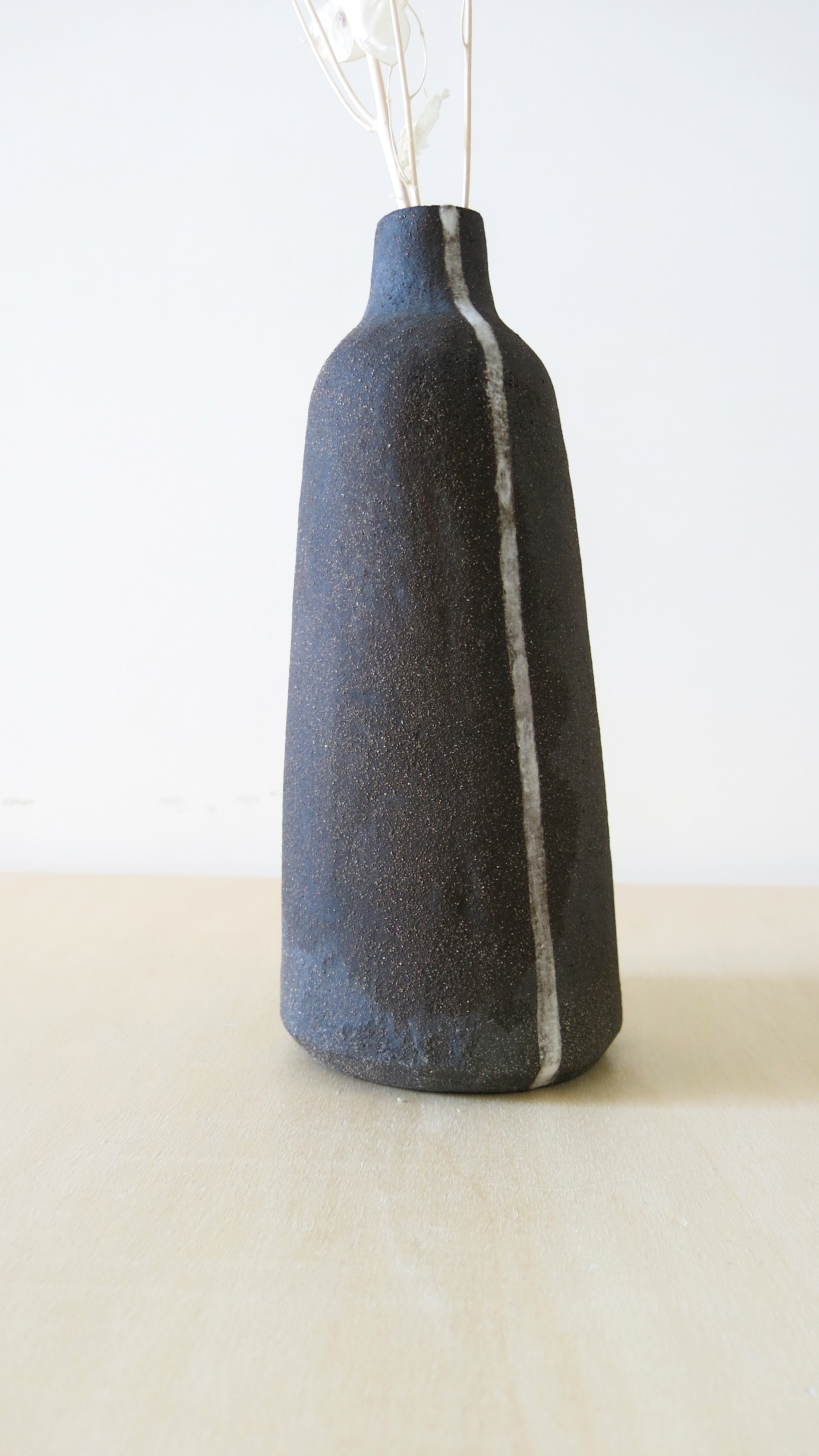 questo vaso è realizzato in terra scura chamottata è cottoin alta temperatura per connotarlo di bel color bruno.La sua particolarità è un piccolo manico su di un latoche diventa una sorta di ala che lo rende unico.